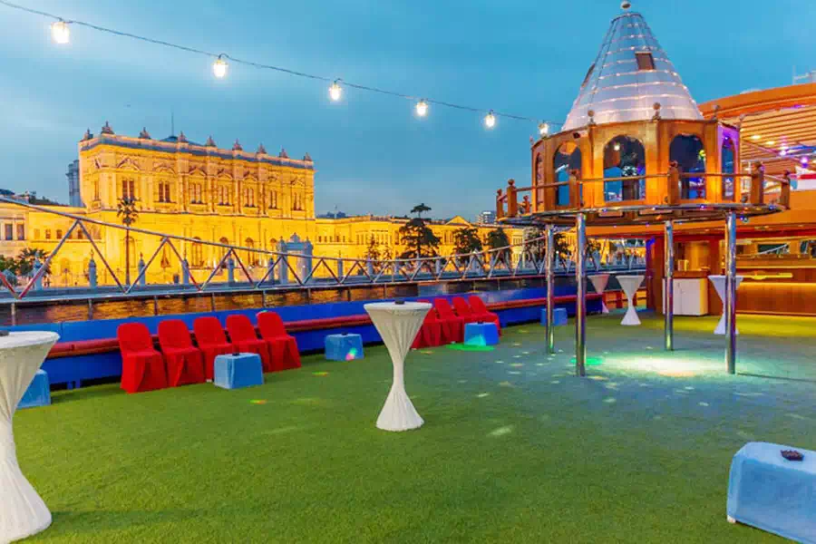Our dinner cruise boat, which is the most luxurious restaurant boat in Istanbul. It has 3 decks: a closed deck, a semi-open deck, and an open deck.